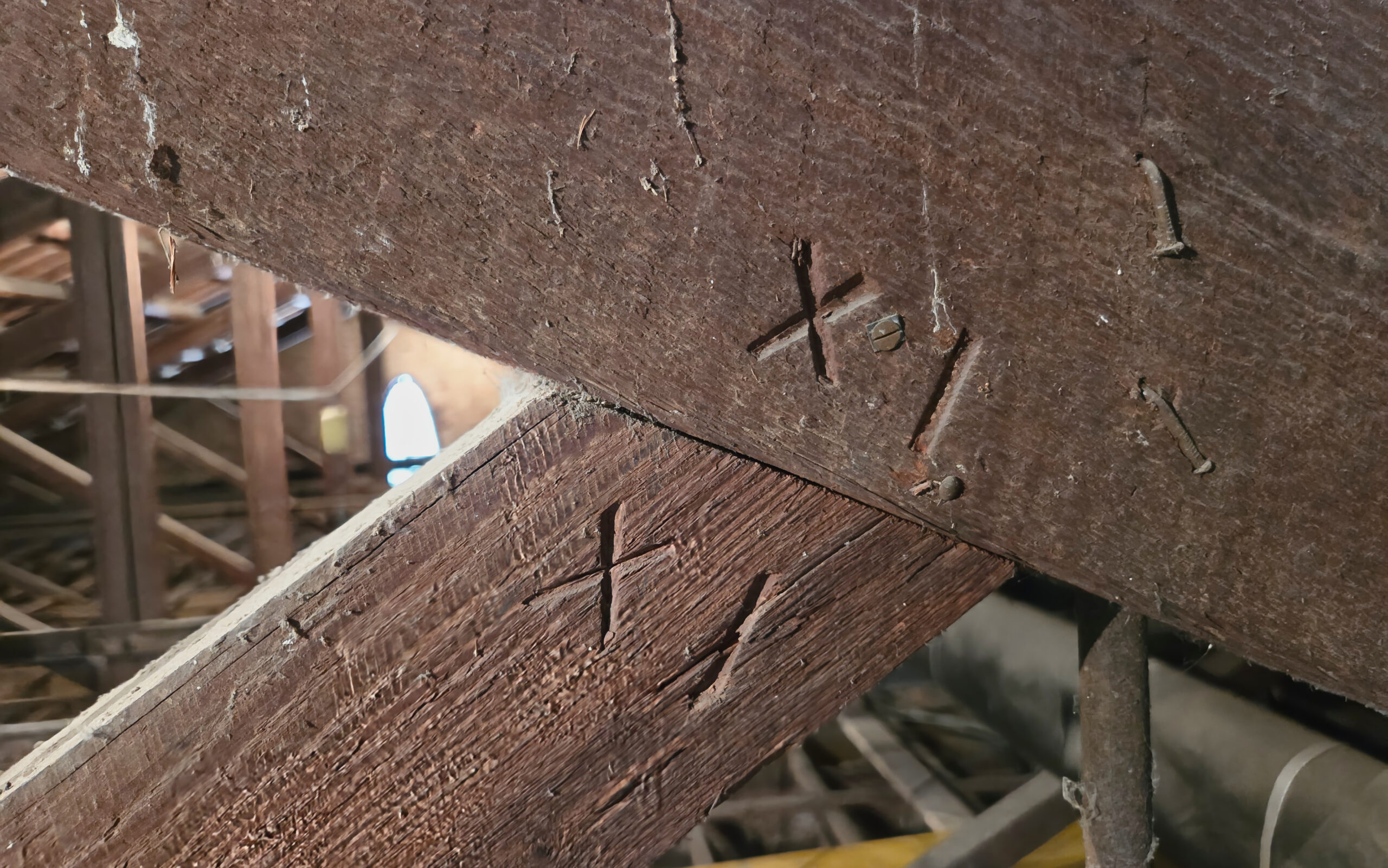 Estas señales —en forma de cruces, líneas o numeraciones— eran esenciales para identificar y orientar cada componente durante el montaje, cuando las cerchas se probaban en el suelo del taller antes de ser trasladadas a la obra.